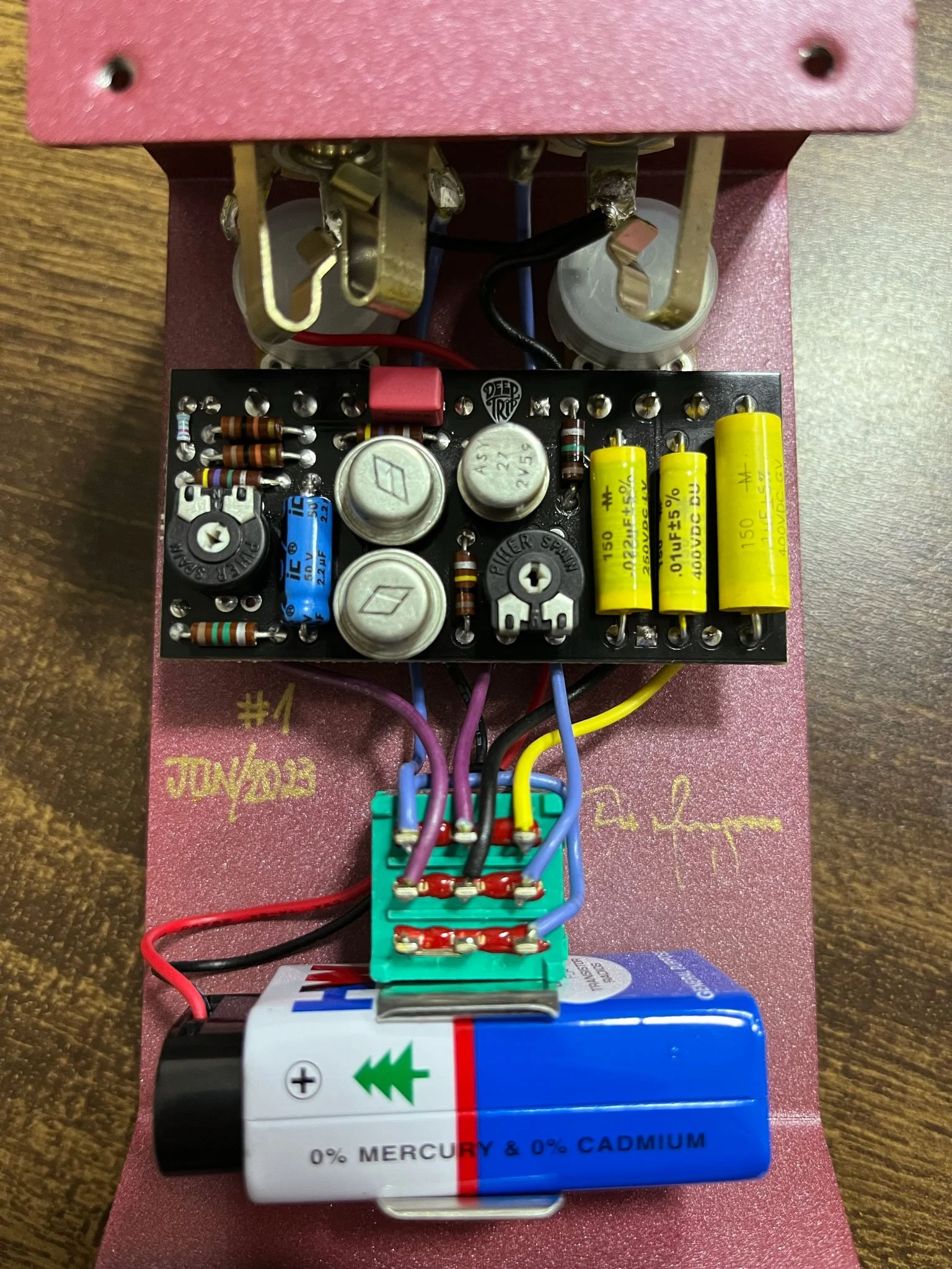 Esse pedal é fruto de uma ideia que surgiu no auge da pandemia, quando não estávamos conseguindo montar nossa linha de pedais tradicional. Por isso, ele é soldado exclusivamente por mim, Du Menegozzo, do começo ao fim: eu faço todas as soldas das placas, monto toda a fiação com muito cuidado e planejamento, sem margem para erros. É uma espécie de custom shop da Deep Trip, que inauguramos com o Onça-Pintada em 2023 e pretendemos expandir com lotes limitados de boosters, fuzzes e drives, sempre usando componentes New Old Stock, como transistores e diodos de germânio.